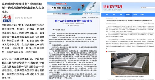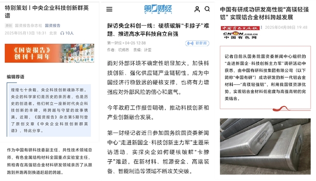 7月20日,《人民日报》头版头条刊发年中经济观察,报道了中国有研科技成果转化最新进展。近期,新华社、《科技日报》、中国网财经、国资小新、《中国证券报》等多家主流媒体,持续关注报道中国有研科技创新的重要进展,其中,中国有研“高镁轻强铝”的诞生之路持续受到社会广泛关注。
